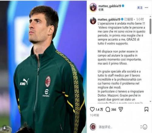 米蘭后衛(wèi)加比亞更新社媒動態(tài),確認(rèn)已成功接受腹股溝疝手術(shù)。