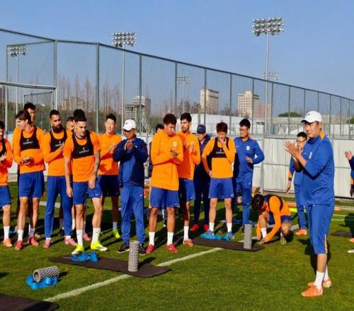 韓鵬在冬訓(xùn)中指導(dǎo)球員們訓(xùn)練。(泰山俱樂部供圖)