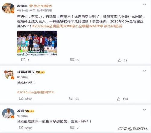 媒體人“麥穗豐”發(fā)文點(diǎn)評:有決心,有實(shí)力,有熱情,有技術(shù)!徐杰再次證明了,身高其實(shí)也不是什么問題,在精神上成為巨人,一樣能夠獲得非凡的成就!恭喜徐杰,2026年CBA全明星正賽MVP!