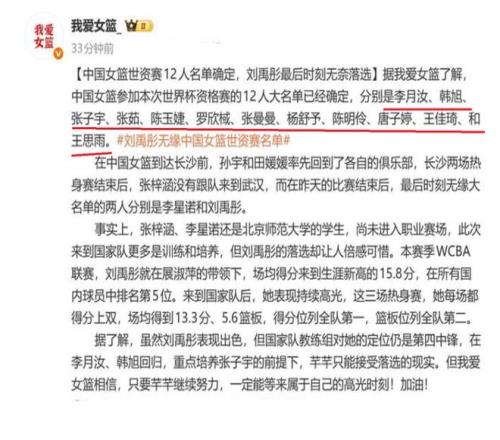 中國(guó)女籃12人大名單出爐!王思雨韓旭領(lǐng)銜,熱身賽的得分王劉禹彤,被淘汰出局,有球迷表示:劉禹彤無(wú)緣12人大名單,讓人看不懂呀!