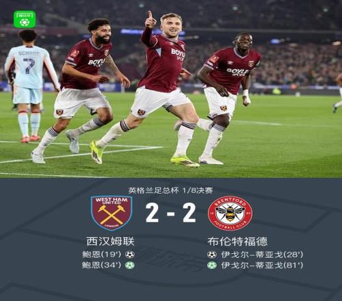 北京時間3月10日英格蘭足總杯 1/8決賽,西漢姆聯對陣布倫特福德。上半場,鮑恩雙響??屏炙诡^槌擊中蒂亞戈得分。下半場,卡約德造點,蒂亞戈主罰命中。90分鐘戰(zhàn)罷,兩隊2-2戰(zhàn)平進入加時賽。