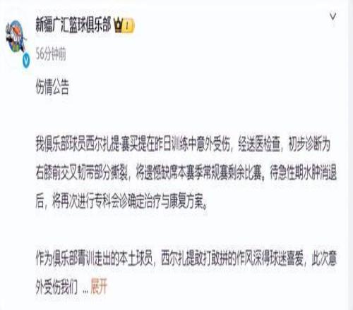新疆男籃本賽季第一階段戰(zhàn)績僅僅排名聯(lián)賽第十五名,連12強(qiáng)都沒能打進(jìn),整體表現(xiàn)遠(yuǎn)低于俱樂部預(yù)期。在朱旭航和吳冠希兩大主力相繼賽季報銷的情況下,新疆男籃本土陣容實力下滑非常嚴(yán)重,再加上外援陣容綜合實力一般,新疆男籃本賽季沖擊季后賽的希望非常渺茫。新疆男籃官方正式發(fā)布球員傷病公告,西爾扎提·賽買提在昨日訓(xùn)練中意外受傷,經(jīng)送醫(yī)檢查,初步診斷為右膝前交叉韌帶部分撕裂,將遺憾缺席本賽季常規(guī)賽剩余比賽。在連續(xù)三名主力遭遇重傷賽季報銷的情況下,新疆男籃本賽季已經(jīng)徹底陷入絕境。