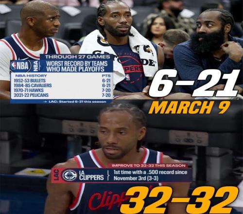 至于快船,同樣因為前期挖坑太大,目前32勝32負(fù)只能排在西部第八,且距離西部第七的太陽(37勝27負(fù))差了5個勝場、距離第六的掘金(39勝26負(fù))差了6.5個勝場。