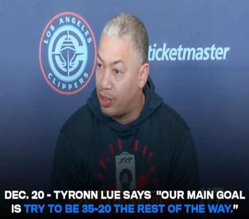 時間回到去年12月,快船對陣湖人的第二次交手之前,泰倫盧在接受采訪時表示,快船要在接下來的比賽里取得35勝20負(fù),從而將勝率提升到50%。