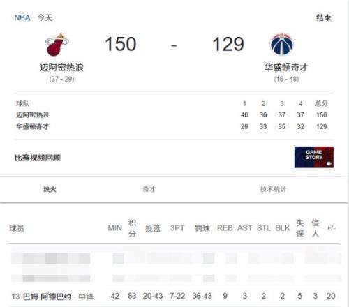 近日,在剛剛結(jié)束的NBA常規(guī)賽熱火VS奇才的比賽中,熱火的球員阿德巴約在比賽中打出了統(tǒng)治級別表現(xiàn),轟下了單場83分,這場比賽熱火以150-129取得勝利。