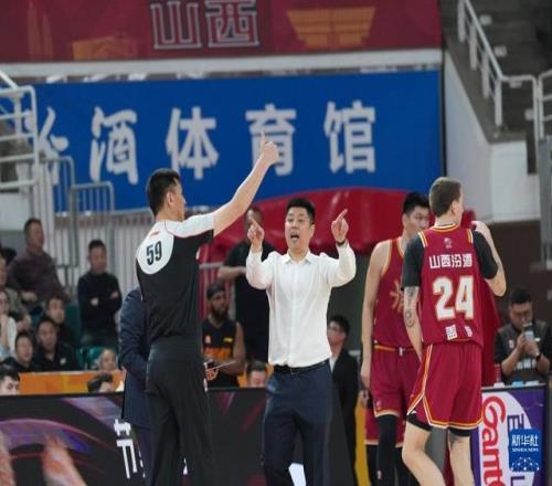 3月11日,山西汾酒隊主教練潘江(左二)在比賽中向裁判申請?zhí)魬?zhàn)。新華社記者 楊晨光 攝