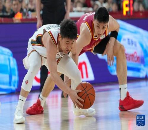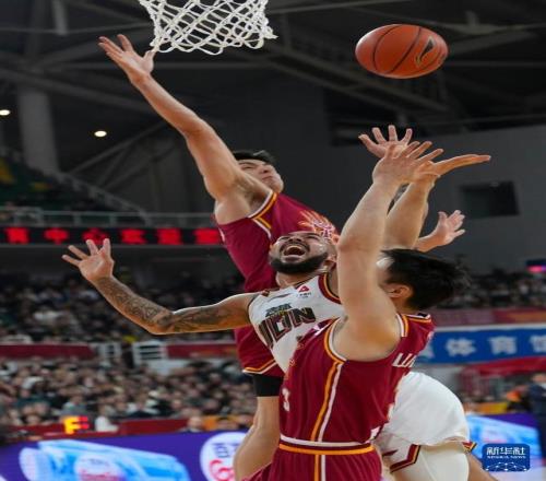 3月11日,吉林長白山恩都里隊球員姜偉澤(左)和山西汾酒隊球員于米提在比賽中爭搶。新華社記者 楊晨光 攝