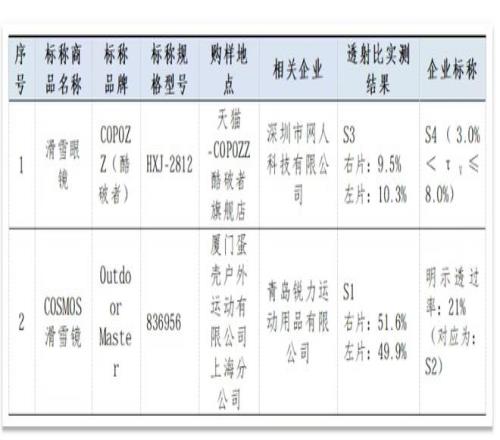 表格顯示,可見光透射比實測等級或數(shù)值與標稱信息不符的樣品分別為深圳市網(wǎng)人科技有限公司生產(chǎn)、商標標稱為“COPOZZ(酷破者)”樣品,以及青島銳力運動用品有限公司生產(chǎn)、商標標稱為“OutdoorMaster”樣品。