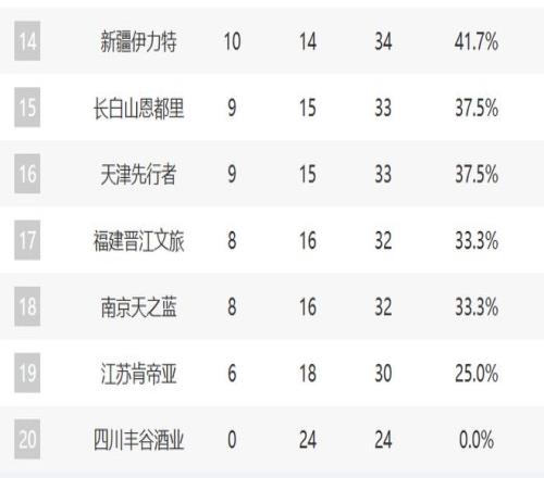 14-20分別是新疆、吉林、天津、福建、同曦、江蘇和四川。新疆這輪擊敗了廣東,目前防守的調(diào)整已經(jīng)越來越好了,進(jìn)攻端的發(fā)揮也不錯(cuò),他們依然有希望直指季后賽。但吉林輸給山西,戰(zhàn)績持續(xù)下滑。天津則保持了兩連勝,他們有點(diǎn)復(fù)蘇的意思了。至于福建和江蘇都是連敗,同曦這輪輸給廣廈,這三支球隊(duì)好像距離季后賽漸行漸遠(yuǎn)了。四川現(xiàn)在已經(jīng)24連敗了。