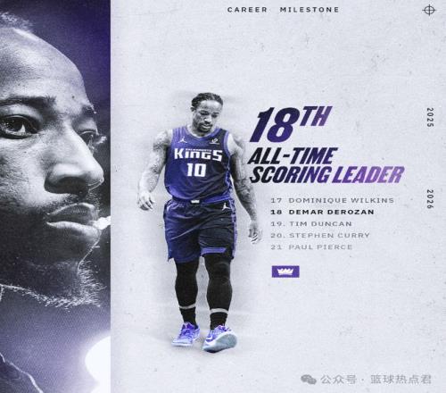 比賽結(jié)束后,他悄然完成了一個(gè)里程碑:職業(yè)生涯總得分達(dá)到26505分,超越蒂姆-鄧肯的26496分,升至NBA歷史得分榜第18位。