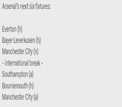 阿森納未來6場比賽:主戰(zhàn)埃弗頓、主戰(zhàn)勒沃庫森、聯(lián)賽杯決賽對曼城、國際比賽日、客戰(zhàn)南安普頓、主戰(zhàn)伯恩茅斯、客戰(zhàn)曼城。