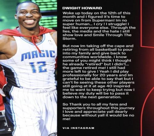 3月13日,40歲的前NBA球星德懷特·霍華德在社媒發(fā)表長文宣布正式退役?;羧A德生涯曾先后效力于魔術、湖人、火箭、老鷹、黃蜂、奇才、湖人、76人、湖人和中國臺灣聯(lián)賽云豹。