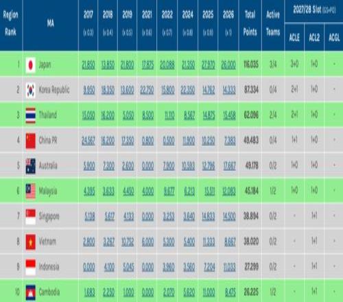 這意味著今夏2026/27賽季亞冠兩大聯(lián)賽揭幕之際,決定2028/29賽季亞戰(zhàn)名額分配的總積分,中超“起評分”僅排名東亞區(qū)第6位。不但被日韓泰遠(yuǎn)遠(yuǎn)拋離,甚至被澳超和馬來超甩在身后,新加坡和越南聯(lián)賽還在緊緊追趕。