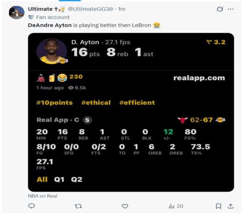 首節(jié)艾頓2中2,上半場20分鐘,10中8,拿到16分8籃板1搶斷0失誤,命中率80%,正負值+12,艾頓在籃下是予取予求。湖人媒體直言艾頓上半場的表現比勒布朗好得多。