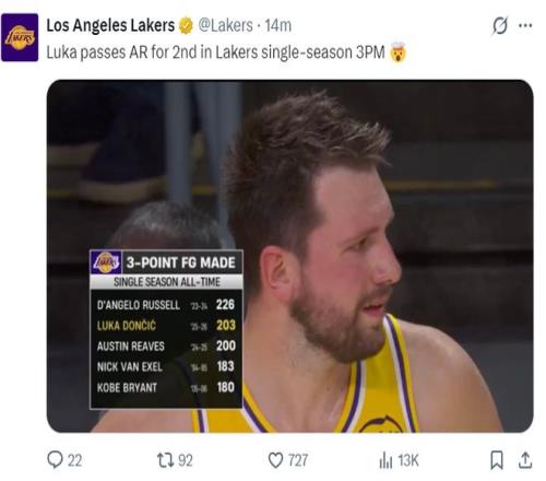 這場比賽東契奇也一戰(zhàn)創(chuàng)造多項紀(jì)錄:1.203+三分已經(jīng)超越里夫斯成為湖人隊史單賽季三分命中第二的球員;
