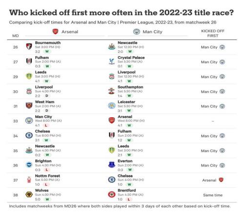在2022-23賽季的沖刺階段比賽中,曼城在73%的比賽中先賽,他們追上了阿森納8分的領(lǐng)先優(yōu)勢,連續(xù)第三年贏得聯(lián)賽冠軍,也是六個賽季中的第五次。
