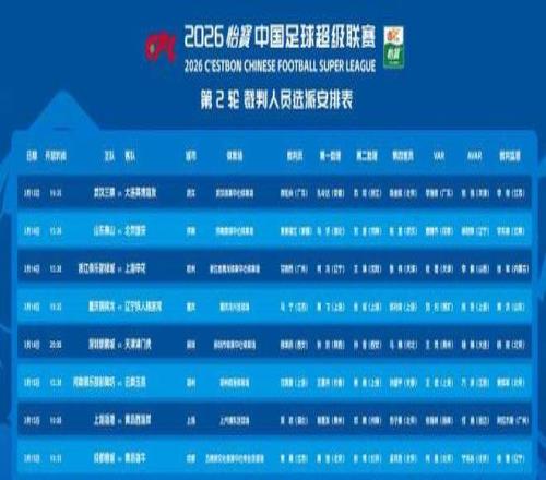 閃電體育3月13報(bào)道今日,中超第2輪裁判安排出爐,麥麥提江主哨焦點(diǎn)大戰(zhàn)山東泰山vs北京國(guó)安,VAR唐順齊,本場(chǎng)比賽將于3月14日周六15:30進(jìn)行。