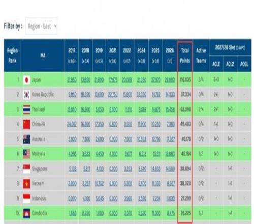隨著柴楨晉級亞洲挑戰(zhàn)者聯(lián)賽半決賽,中超本賽季亞冠技術積分已經被柬埔寨聯(lián)賽超越,僅排名東亞第10名。