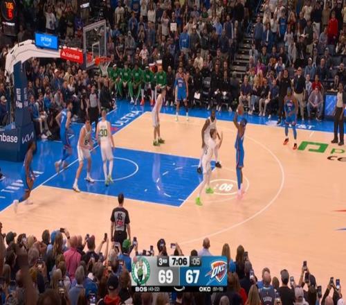 本場第三節(jié),雷霆幾乎全程落后,直至第四節(jié)剩下5分鐘前,雷霆依然以93-94落后凱爾特人1分,隨后亞歷山大接管了比賽: