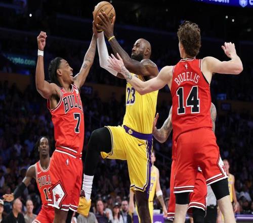 末節(jié)決戰(zhàn),里夫斯單打不中,詹姆斯被吹犯規(guī),雷迪克挑戰(zhàn)判罰成功。詹姆斯中距離取分,理查茲回敬2+1,詹姆斯強(qiáng)勢(shì)上籃得分,八村塁大帽布澤利斯??霞{德與米勒對(duì)射三分球,吉迪拋投取分,特雷瓊斯2罰全中,公牛將分差縮小至7分。里夫斯連續(xù)高難度單打獨(dú)得5分,芝加哥請(qǐng)求暫停。詹姆斯、史密斯各有2罰全中,艾頓在籃下連進(jìn)2球,湖人穩(wěn)住局面。