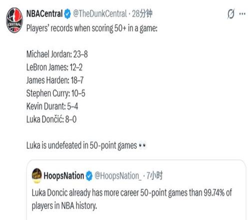 球星50+分戰(zhàn)績(jī)曝光!喬丹23勝8負(fù)詹姆斯12勝2負(fù)東契奇8戰(zhàn)全勝
