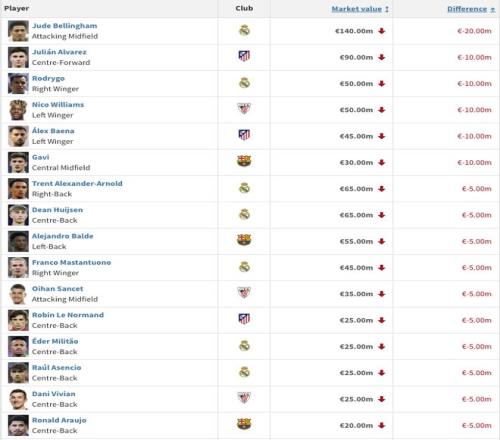 跌1000萬歐5人:阿爾瓦雷斯(馬競,9000萬歐),羅德里戈(皇馬,5000萬歐),尼科-威廉斯(畢爾巴鄂競技,5000萬歐),巴埃納(馬競,4500萬歐),加維(巴薩,3000萬歐)