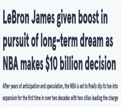 在多年的期待與猜測(cè)之后,NBA終于將在二十多年后首次啟動(dòng)擴(kuò)軍計(jì)劃,西雅圖和拉斯維加斯有望成為NBA兩支新軍所在的城市。NBA即將就期待已久的聯(lián)盟擴(kuò)軍進(jìn)行投票。美媒表示,這一消息將讓詹姆斯備受鼓舞。