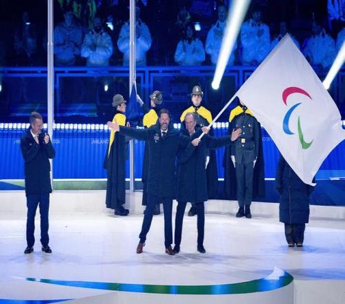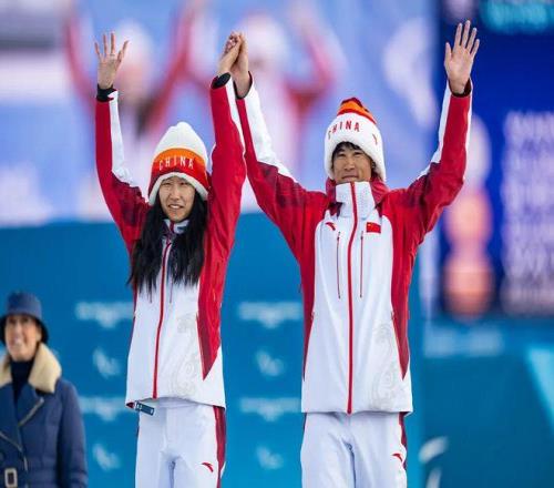 閉幕式中國(guó)體育代表團(tuán)旗手為殘奧越野滑雪和冬季兩項(xiàng)男運(yùn)動(dòng)員蔡佳云、輪椅冰壺女運(yùn)動(dòng)員王蒙。