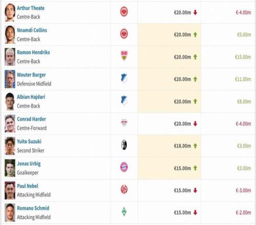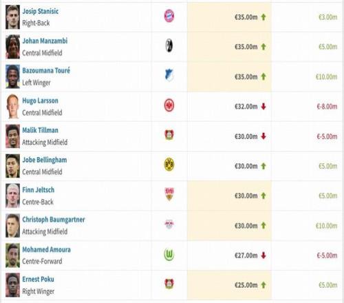德甲部分球員身價變動情況
