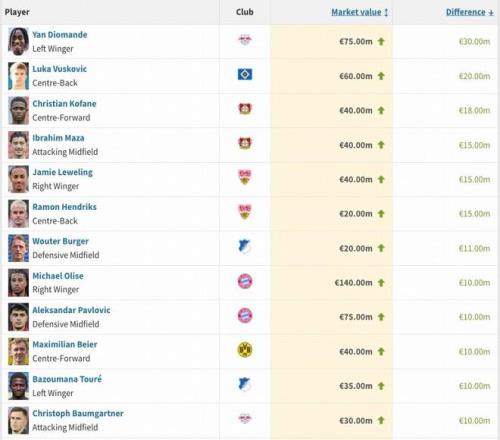 本期德甲有12名球員身價上漲超1000萬歐,其中揚-迪奧曼德上漲3000萬歐最多,武什科維奇2000萬歐,勒沃庫森隊科法內(nèi)上漲1800萬歐,馬扎上漲1500萬歐,斯圖加特隊萊韋林與亨德里克斯均上漲1500萬歐。