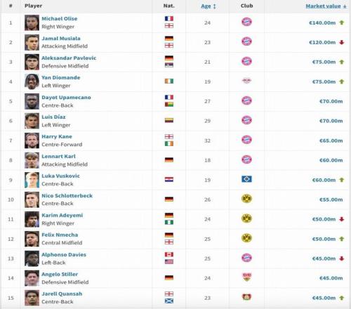 奧利塞以1.4億歐身價領(lǐng)跑德甲,穆西亞拉1.2億歐次之,帕夫洛維奇與揚-迪奧曼德以7500萬歐的身價并列第三。