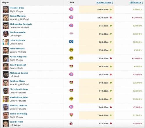 僅兩名球員下跌達(dá)到1000萬歐,分別是拜仁慕尼黑前腰穆西亞拉和多特蒙德邊鋒阿德耶米。