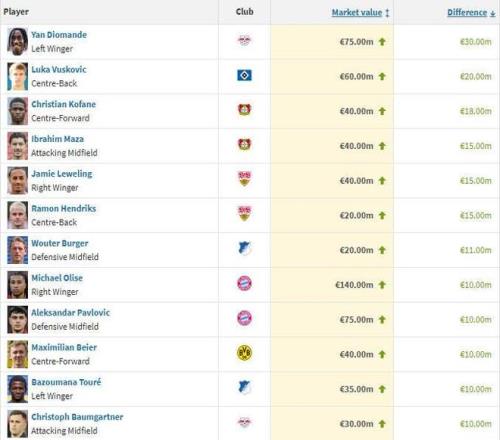德甲球員身價漲幅榜TOP10: